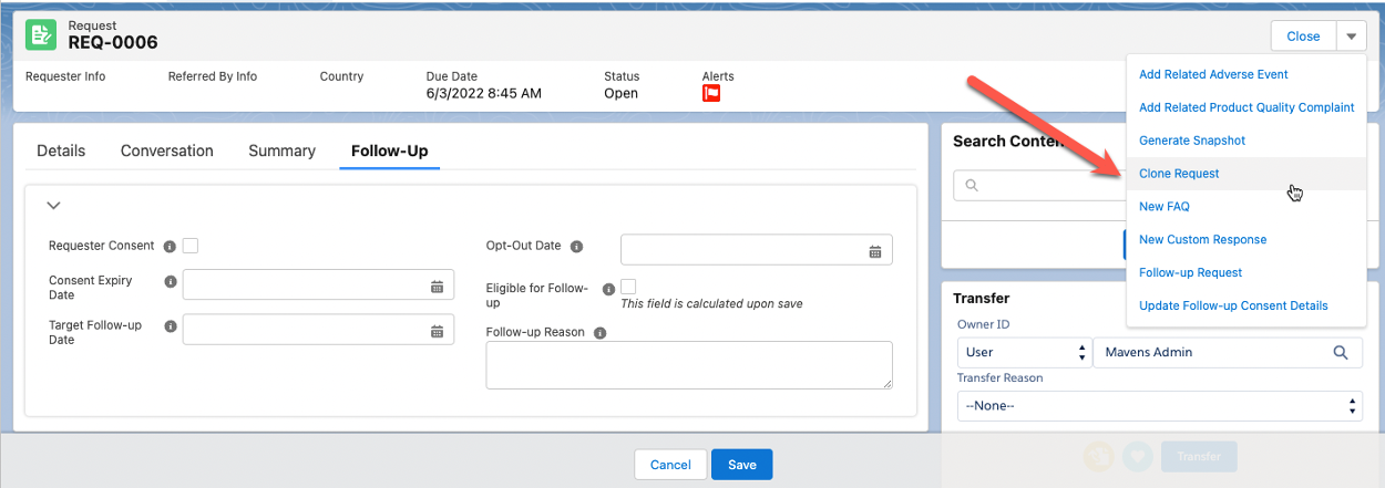 Select Follow-up Request. The Follow-up Request modal appears.