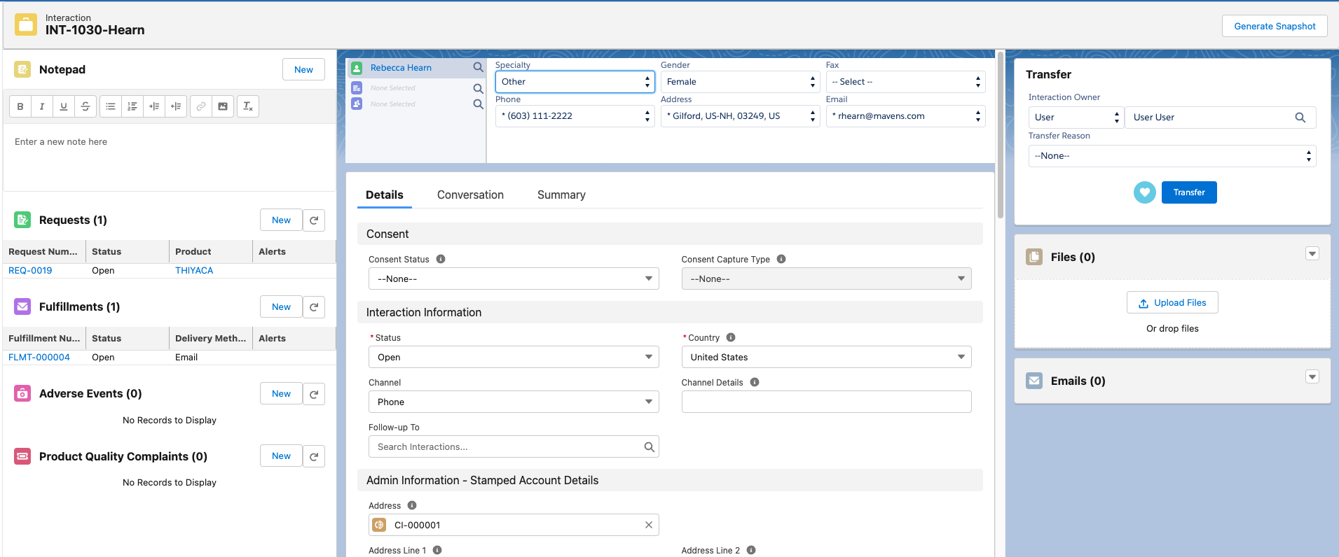 The primary objects in Inquiry Management are Interaction, Request, Fulfillment, Adverse Event, and Product Quality Complaint. With these objects, you can record and manage medical inquiries. Specifically, when a Requester reaches out to your Contact Center, you can create a new Interaction record to store the Requester's contact information and information about how and when the Requester contacted the Contact Center. From this Interaction record, you can then create child records to capture and address inquiries and record reported Adverse Events and Product Quality Complaints. An Interaction can have more than one child record of the same type.