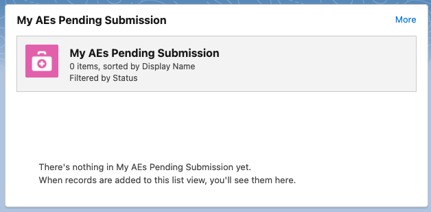 My AEs Pending Submission - shows pending AE submissions. Users can click More in the top right corner to view their Adverse Events page.