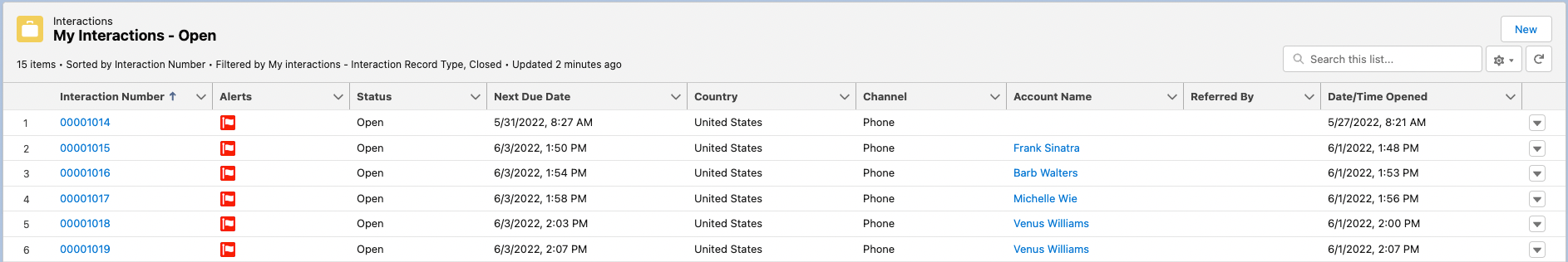 My Interactions - Open - shows the logged-in user's open interactions. New Interactions can also be created from this section by clicking New in the top right of the section's highlight panel.
