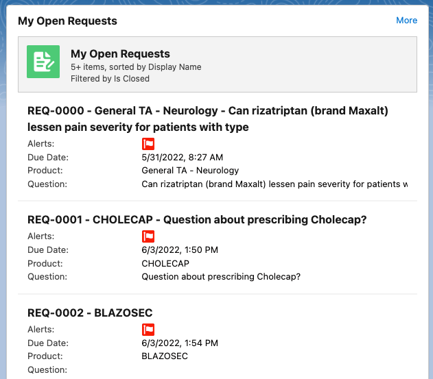 A Request is a child record of an Interaction. Each Request stores information about the account's inquiry and any responses that have been provided. There can be multiple Requests in a single Interaction. For example, if a Health Care Provider asks three questions on a call, you will create a single Interaction and three Request records underneath that Interaction.