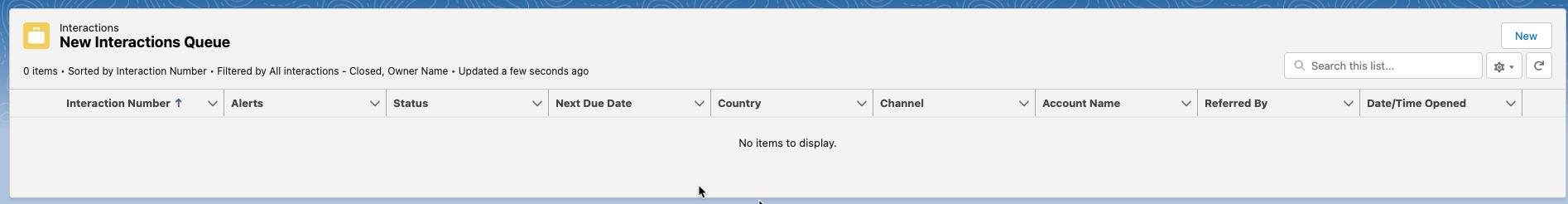 New Interactions Queue - shows any newly assigned or created interactions for the logged-in user. Users can also create new Interactions from this section by clicking New in the top right corner of the section.
