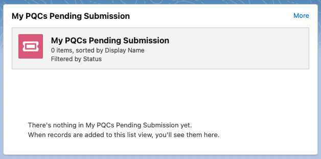 My PQCs Pending Submission - shows pending PQC submissions. Users can click More in the top right corner to view their Product Quality Complaint page.