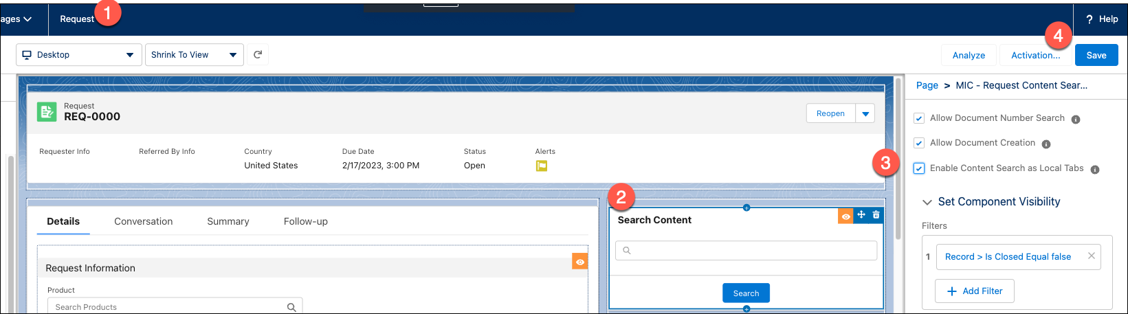 To meet these requirements, Sylvia adds the MIC - Console Config component to the Request Lightning record page and configures the component per the table below. She adds Request as the Default Tab Label in case the Tab Field Name does not resolve with a valid value.