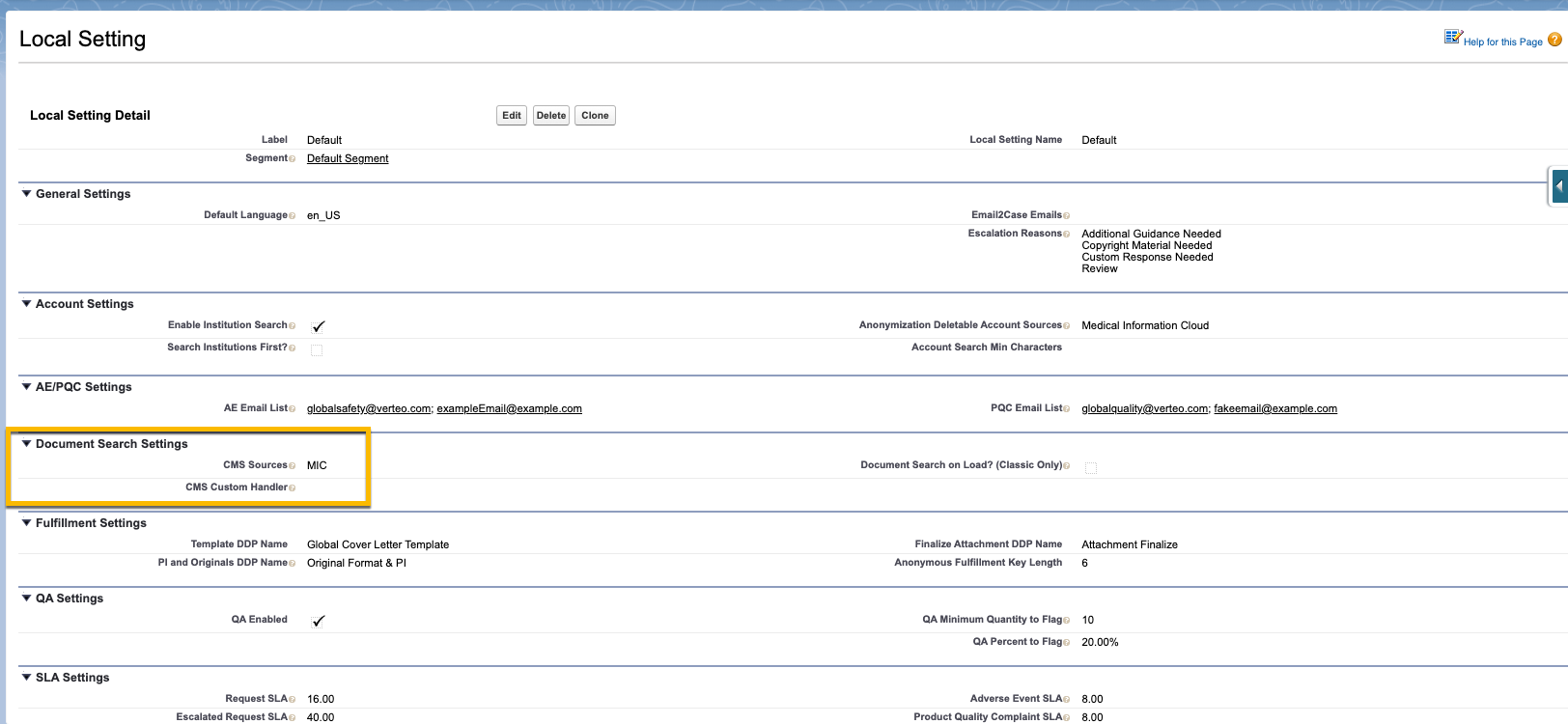 The Work Instruction feature is designed to work with your existing content repository already configured within your instance, requiring only configuration to enable. To verify your existing configuration, navigate to Setup > Custom Metadata Types > Local Setting (MED_Local_Setting__mdt) to review your configured document search settings.