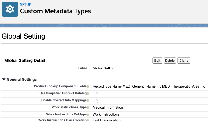 The Global Setting (MED_Global_Setting__mdt) custom metadata type possesses the document classification for Work Instruction content items. The specific fields that must be populated within the Global Setting custom metadata type are as follows: