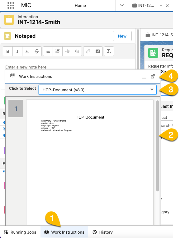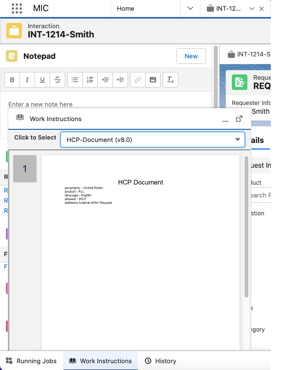 The Work Instructions component renders a preview of relevant, internal documentation files in a document viewer. Configured parameters determine the list of documents that you can view in the component. For example, the available documents may change as you move throughout the application and/or enter data, such as the name of a product and/or the type of Requester, into the application. The component appears in a collapsible window that you can launch from the utility bar from anywhere within the application.