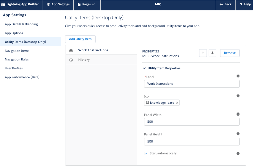 2. Expose the Work Instruction utility bar user interface component within your application.