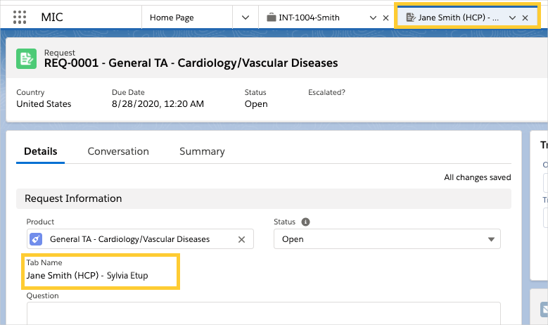 To test the configuration of Tab Field Name, Sylvia Etup creates an Interaction, adds Jane Smith as the Requester, and creates a Request record. Upon creation of the Request record, the Request tab label displays Jane Smith (HCP) - Sylvia Etup.