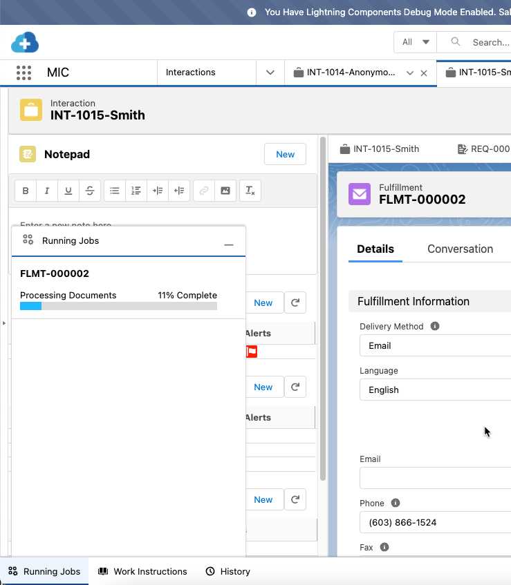 • Running Job (MIC - Nintex Queue) - displays the progress of package generation jobs. For instructions on how to enable this component in the utility bar, visit Fulfillment Package Generation.