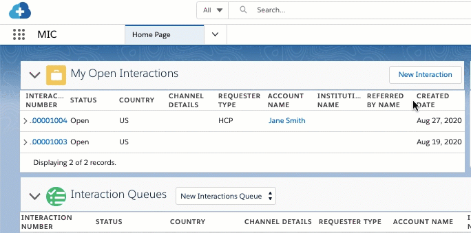 MIC - Related ListDisplays Request, Fulfillment, Adverse Event, Product Quality Complaint, and Interaction QA records related to a given Interaction and enables users to create new related records. While similar to the standard Salesforce Related List - Single component, the MIC - Related List component requires fewer clicks to create new related records. It also displays related records in a more compact, table grid-view, and includes more configuration points than the Related List - Single component.All SObjects