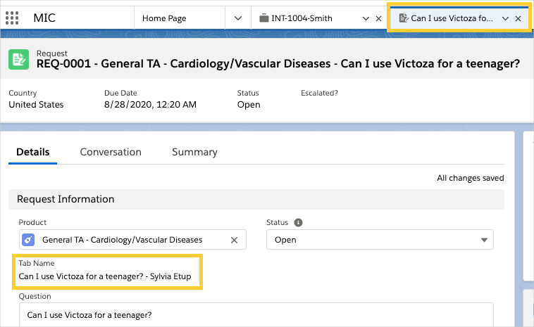 Sylvia then adds this question to the Request record: Can I use Victoza for a teenager? The tab label displays Can I use Victoza for a teenager? - Sylvia Etup.
