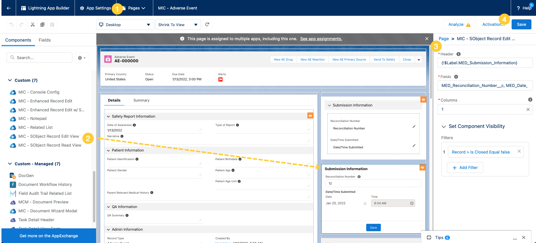 1. Set the MIC - SObject Record Edit View component visibility to Record \> Is Close Equal false and set the Record Detail component visibility to Record \> Is Closed Equal true.