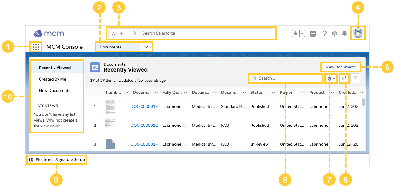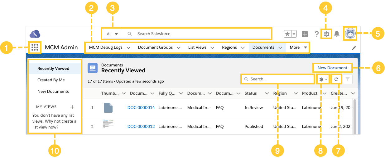| 1 | App Launcher | Lists all Salesforce apps that are available to you. Through the App Launcher, you can navigate to the MCM Console or the MCM Admin console. |