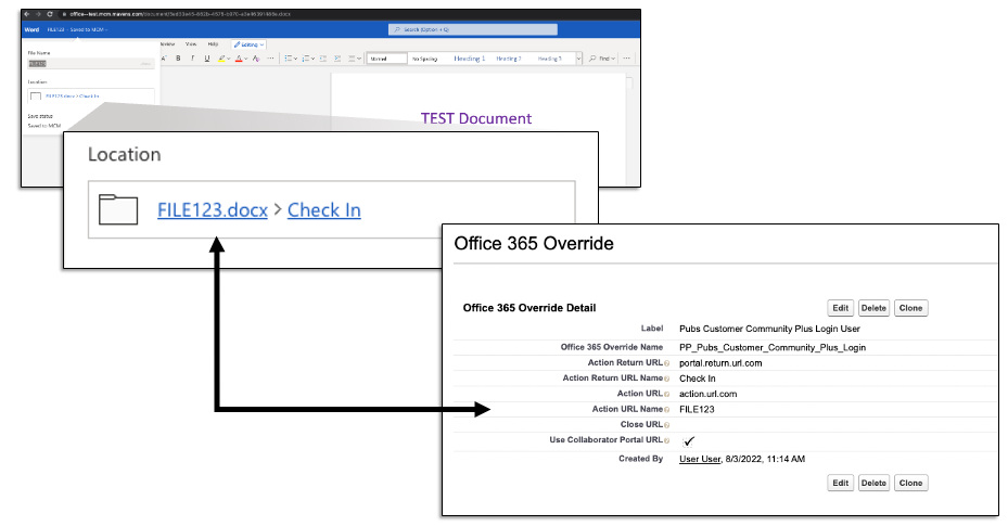 For instance, you can configure the Microsoft 365 integration settings so that external document collaborators can click on a specific hyperlink to navigate from a document in Microsoft 365 back to the Collaborator Portal. An example of a file path and its associated settings is shown below.