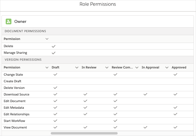Document permissions - a list of document and document version permissions, which grant users or groups of users system-defined actions at either the document or document version level. The topic also includes information about the Document State Role and Document State Permission custom metadata types, which determine what Roles can do throughout a document's lifecycle.